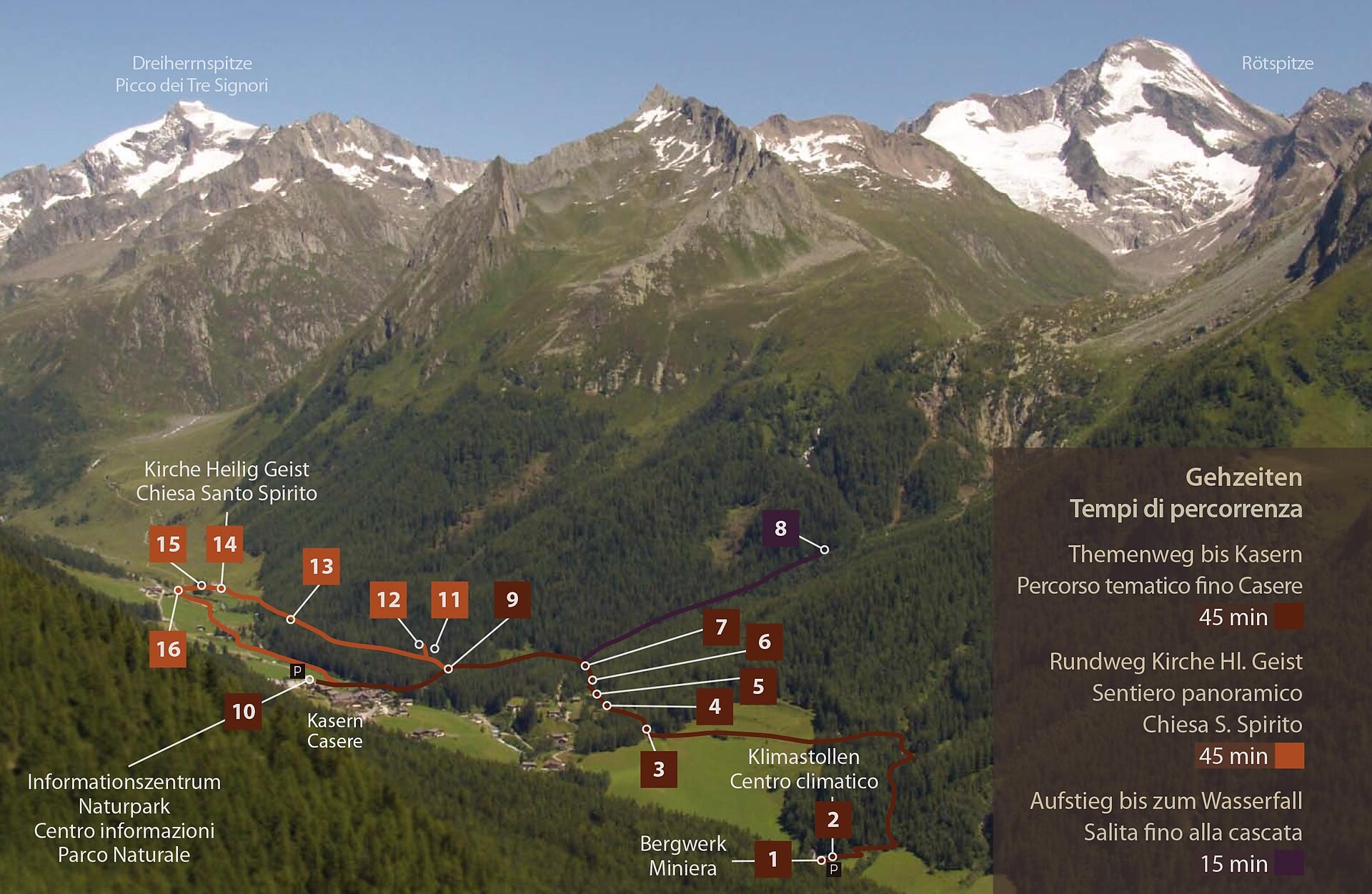 Der Prettauer Gesundheitsweg startet am Gelände des Klimastollens von Prettau und erstreckt sich über eine Länge von ungefähr 5 km. Er beginnt leicht ansteigend, führt vorbei an einer Knappensiedlung, am Pochwerk und am Rebeccastollen des Kupferbergwerkes. Ab da führt der Weg fast ebenerdig bis zum Ziel. Wer möchte, probiert die Wirkung des Feucht-Ionen-Windes am Wasserfall, dieser verringert die Anfallshäufigkeit bei Asthmatikern und Allergikern. Intensiv erlebt werden kann auch die für Asthmatiker heilsame Hochgebirgsluft, die sauber, schadstoff- und allergenarm ist. Am Naturbadeteich gibt es die Möglichkeit einer Kaltwasseranwendung nach dem Therapieprinzip Kneipp und durch das Gehen am Barfußweg wird das Immunsystem gestärkt. Weitere Stationen am Gesundheitsweg Prettau sind: Das Knappenhaus „Mösern“ mit der angebauten kleinen Kapelle, das Hl.- Geist-Kirchlein, die Almsiedlung Prastmann und das Naturparkhaus in Kasern.